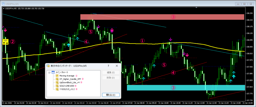 • 出来高 (Tick Volume): 移動平均を超える高い出来高を伴っているかをチェックし、精度の高いゾーンを厳選します。