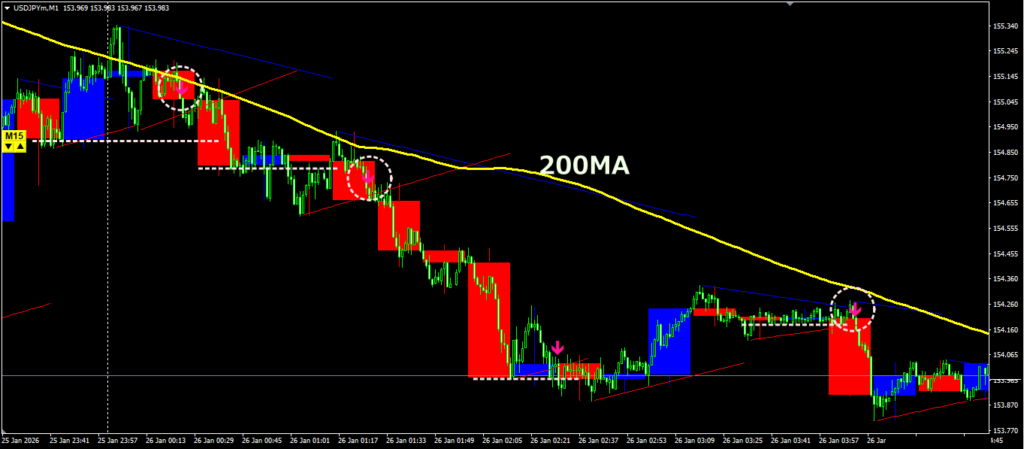一方的な動き(100pips超え)は、必ず200MAと乖離が出ます。このような環境で買いの連続、売りの連続は要注意です。