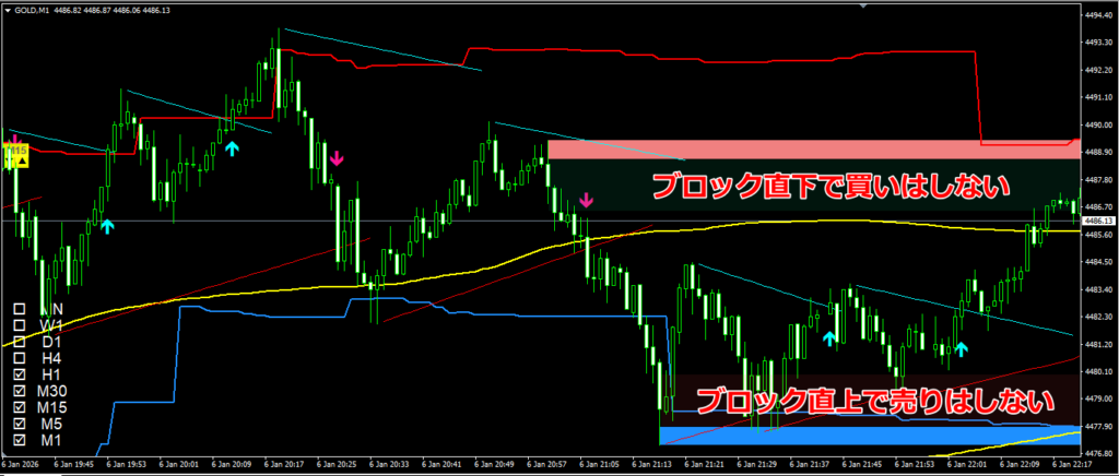 - 強い抵抗ライン、押し安値、戻り高値を強く意識しています。これらのラインは反発率が高いので、戻り高値ラインの手前では売り目線、押し安値ラインの手前では買い目線としています。良い結果が続いていますが、大口の決済、注文動向を示す「Oder Block」によるゾーンの活用は有効でしょうか?