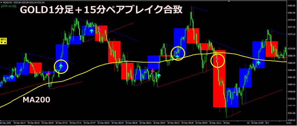 GOLDで待つ間、他の通貨ペアで条件が揃うことがあればポジション取りは有効ですが、ボラの違いが大きいので、狙い過ぎず手堅い利食いで終えることがお勧めです。