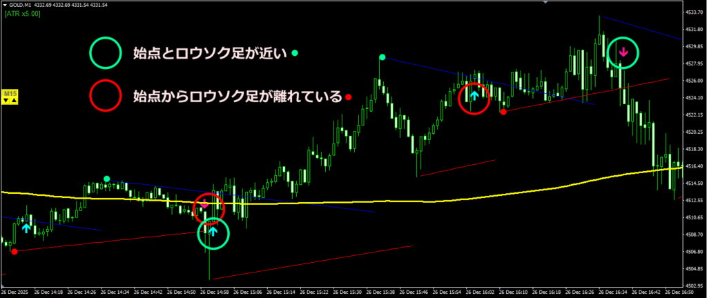 はい、あります。転換ラインを単独で見た場合、始点から終点までの間に乖離があるか、ないかです。乖離がある場合は、既に動きがあった後になる場合が多く、出遅れ、もみ合いになりやすいです。シンプルに、転換ラインとロウソク足が離れているか、近いか、その振り分けだけで勝率が上がるだけでなく、利幅も伸ばせるエントリーに絞れます。