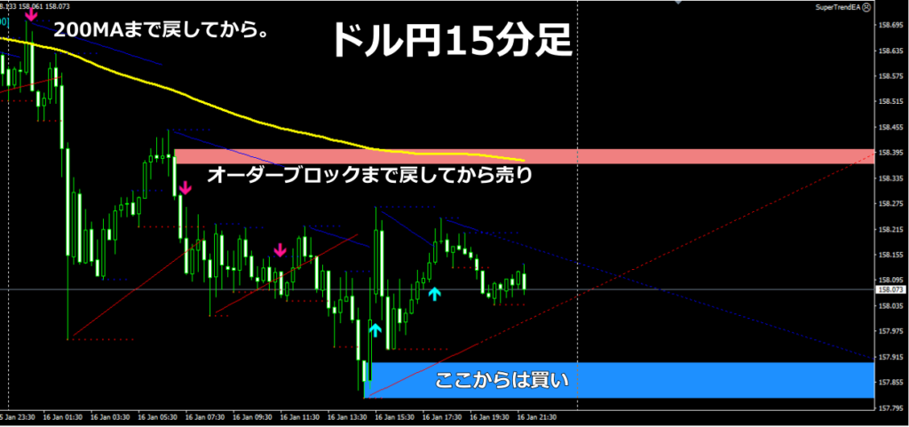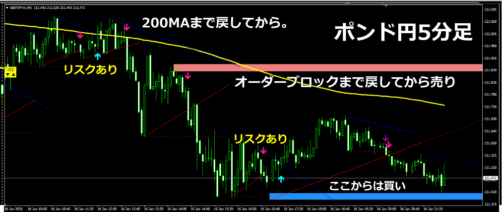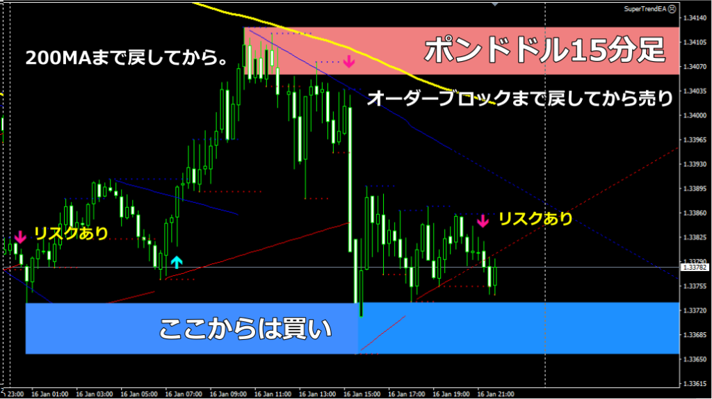 - 騙し回避: レンジの端にあるOBにタッチする際、一瞬だけOBを突き抜けて「個人投資家の損切り」を巻き込んでから反転することが多いです。プロはこの「だまし」を確認してからエントリーします。